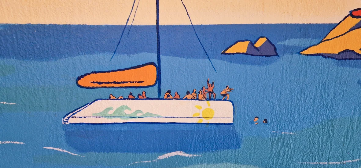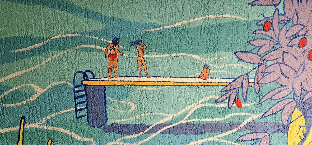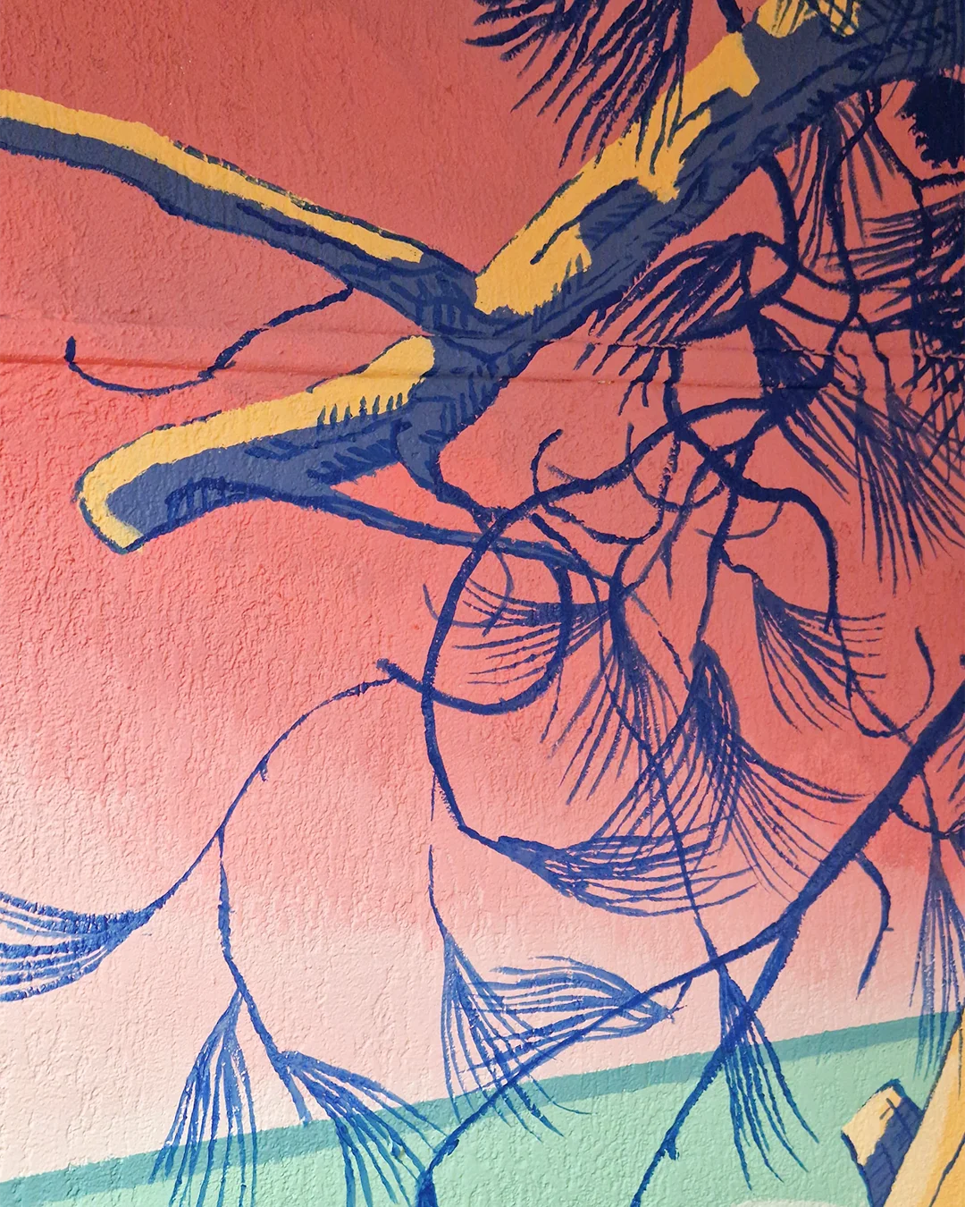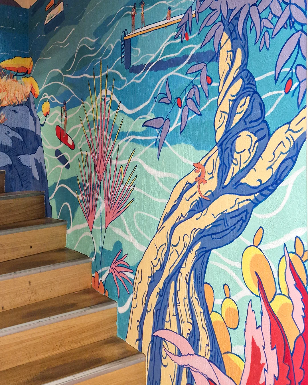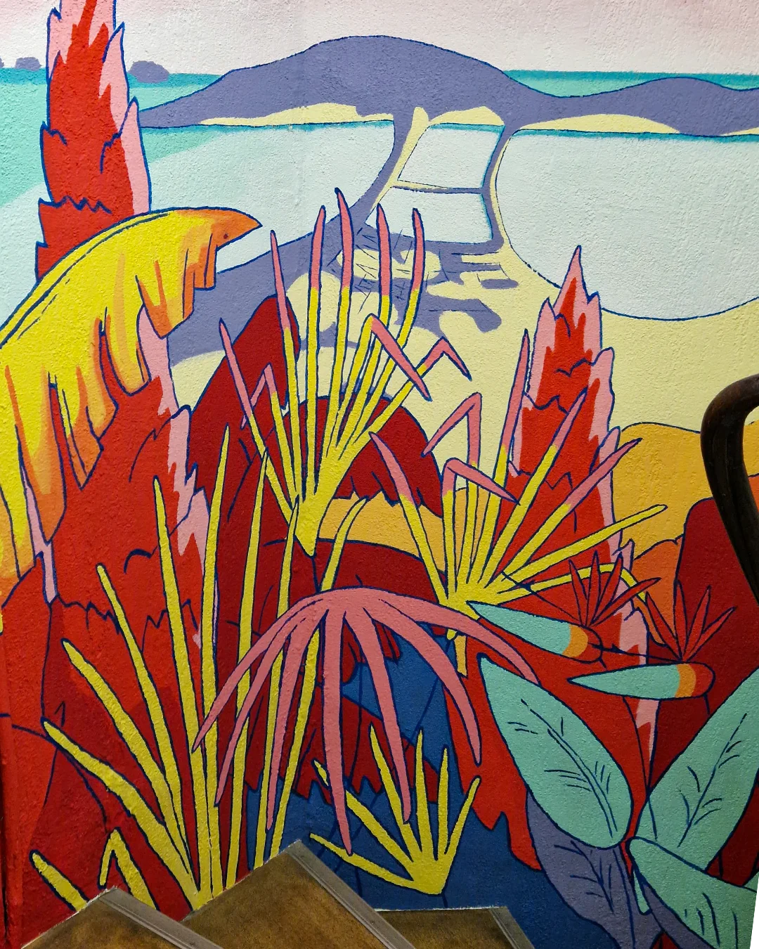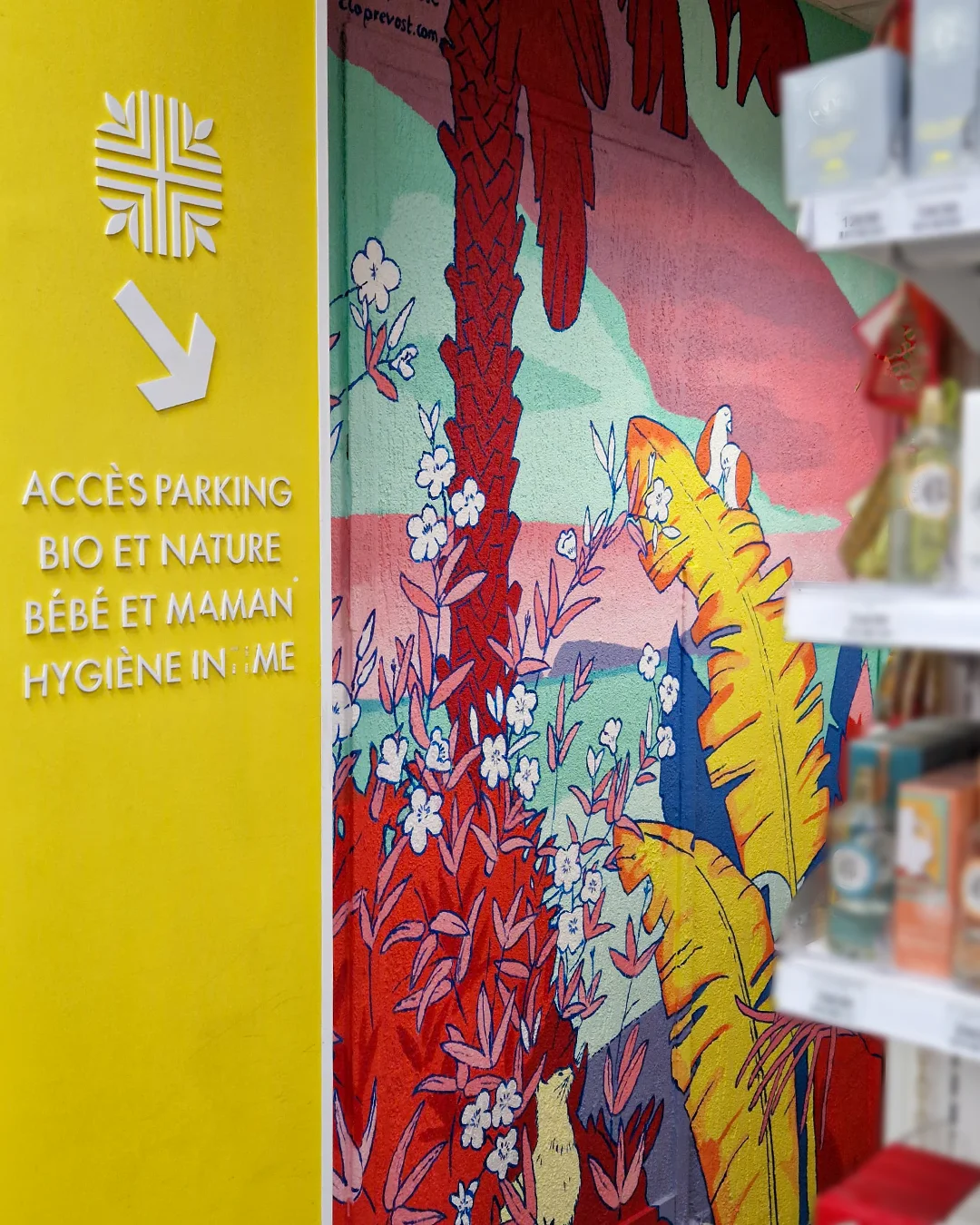 Afin d’embellir et de moderniser la cage d’escalier de la Grande Pharmacie Hyéroise, du groupe Apothical j’ai créé une fresque dont les couleurs fraîches et joyeuses ont pour but d’attirer l’œil des clients et de rendre le passage plus agréable. 🌴☀️