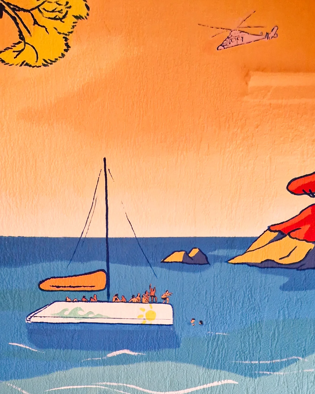 En descendant, le passant surplombe la presqu’île de Giens et plonge progressivement dans la mer d’azur avec de petits plaisanciers. En montant, le spectateur passe d’un univers d’eau à une jungle aux couleurs chatoyante.