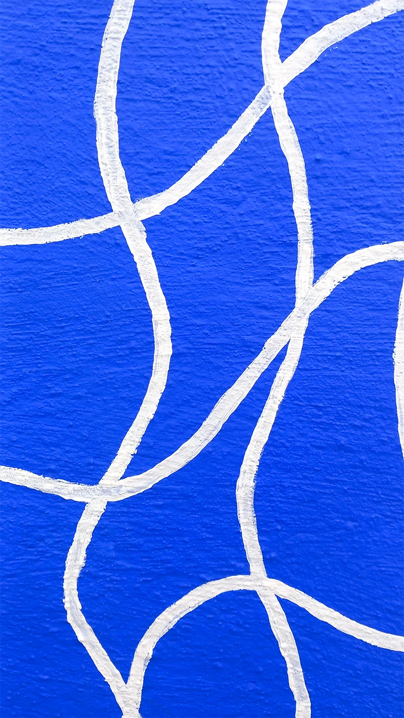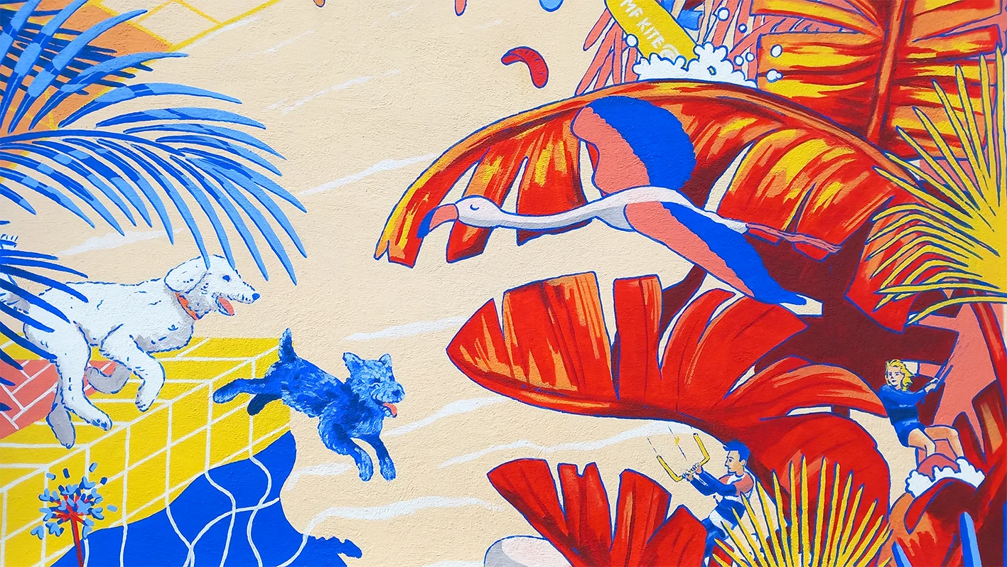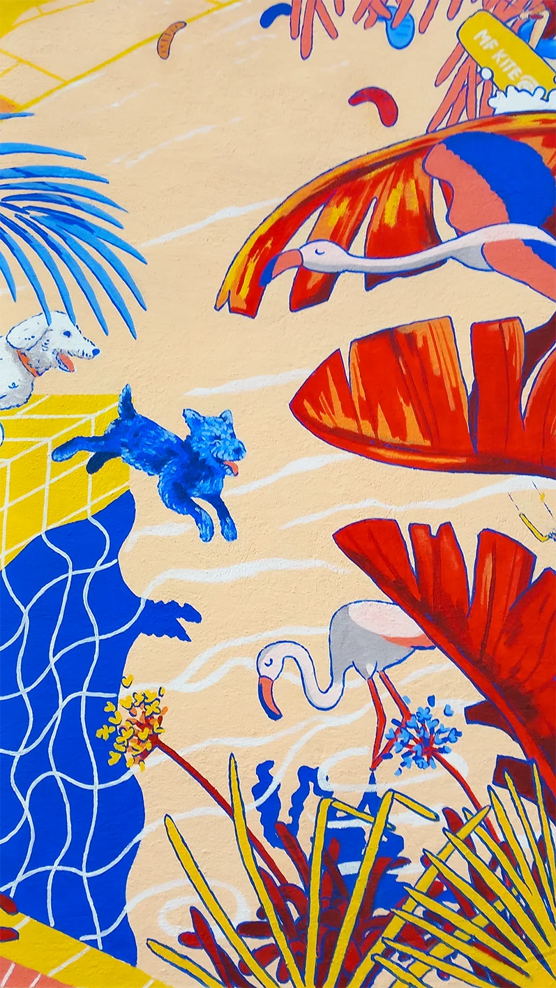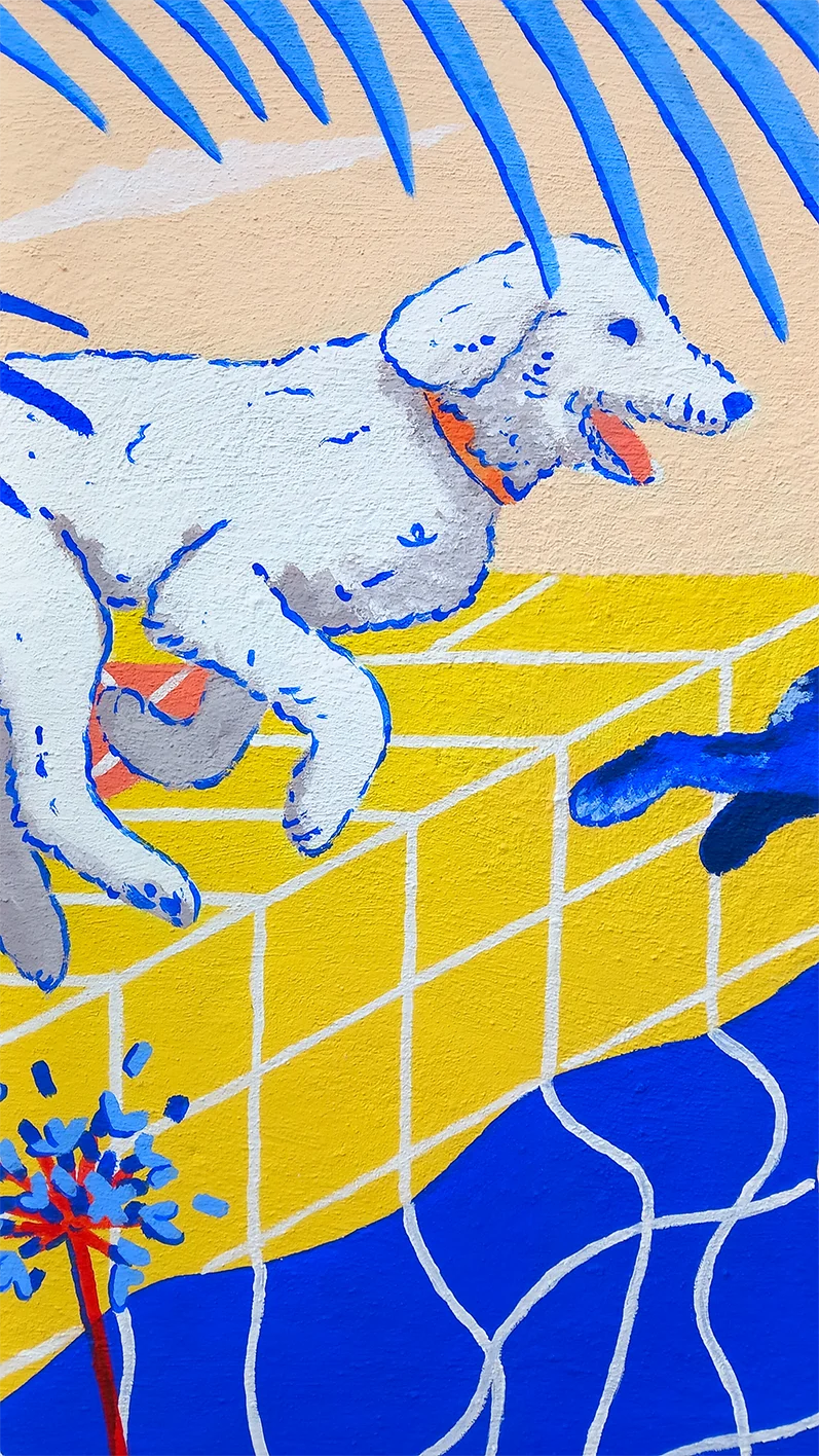 Le mouvement est suggéré par le dynamisme des voiles, les courbes des plantes, les poses sportives des personnages, et l’attitude joueuse des chiens. Ces éléments ont été assemblés entre eux avec l’aide du nombre d’or, pour un effet tourbillonnant. 💫🌊 Graphiquement, les ondulation organiques (végétale, eau, reflets) rencontrent les lignes tendues des carreaux de la terrasse et de la piscine.