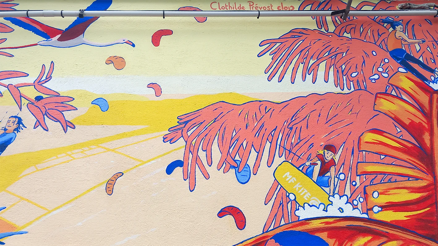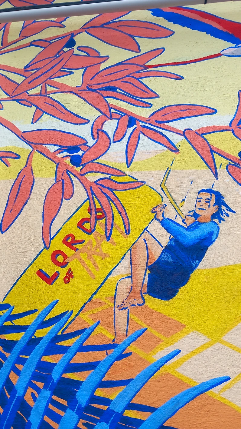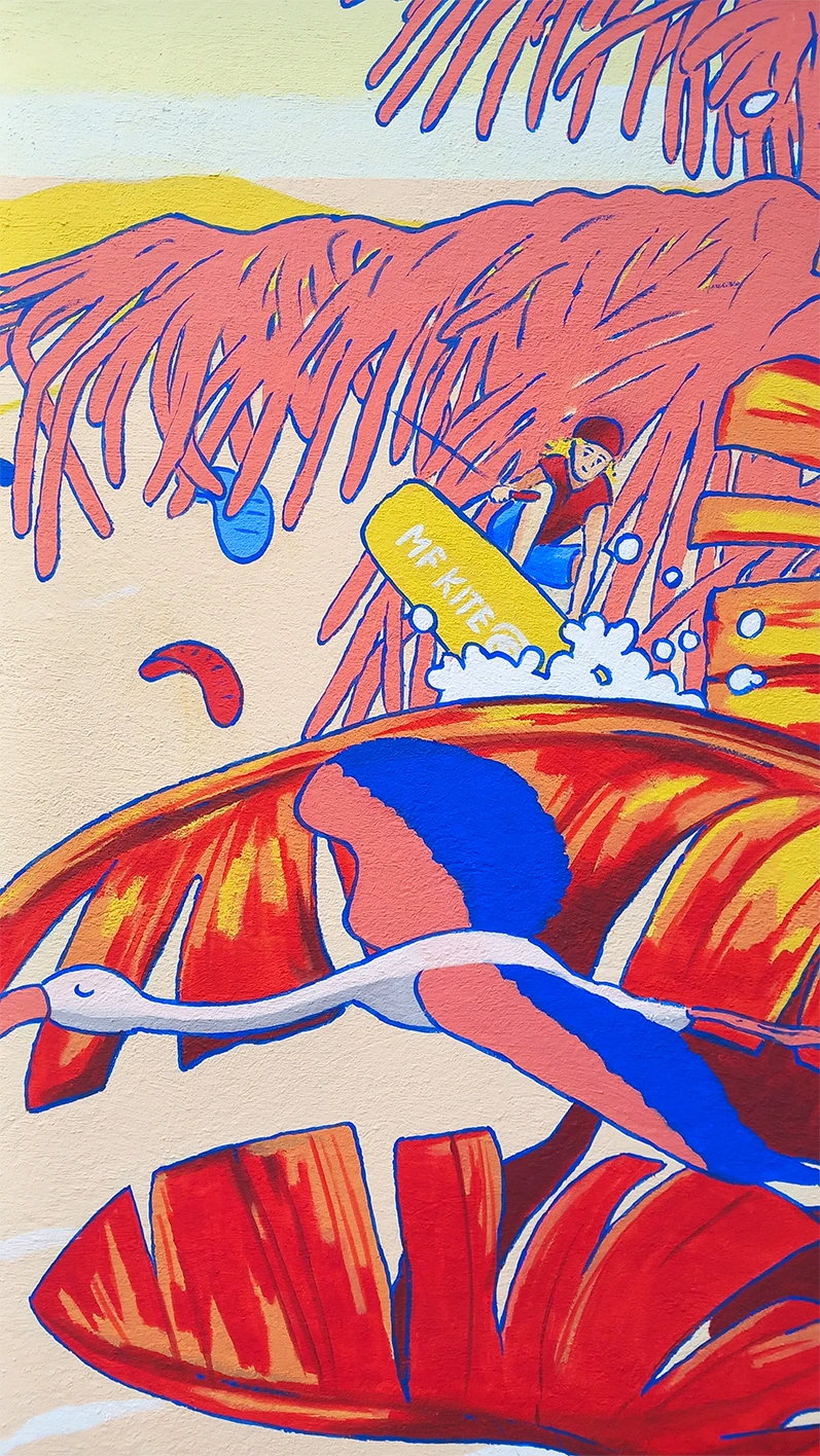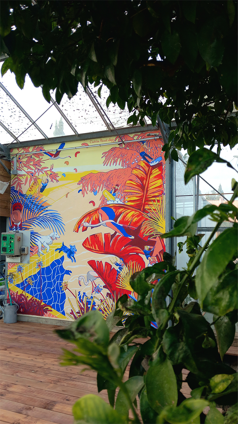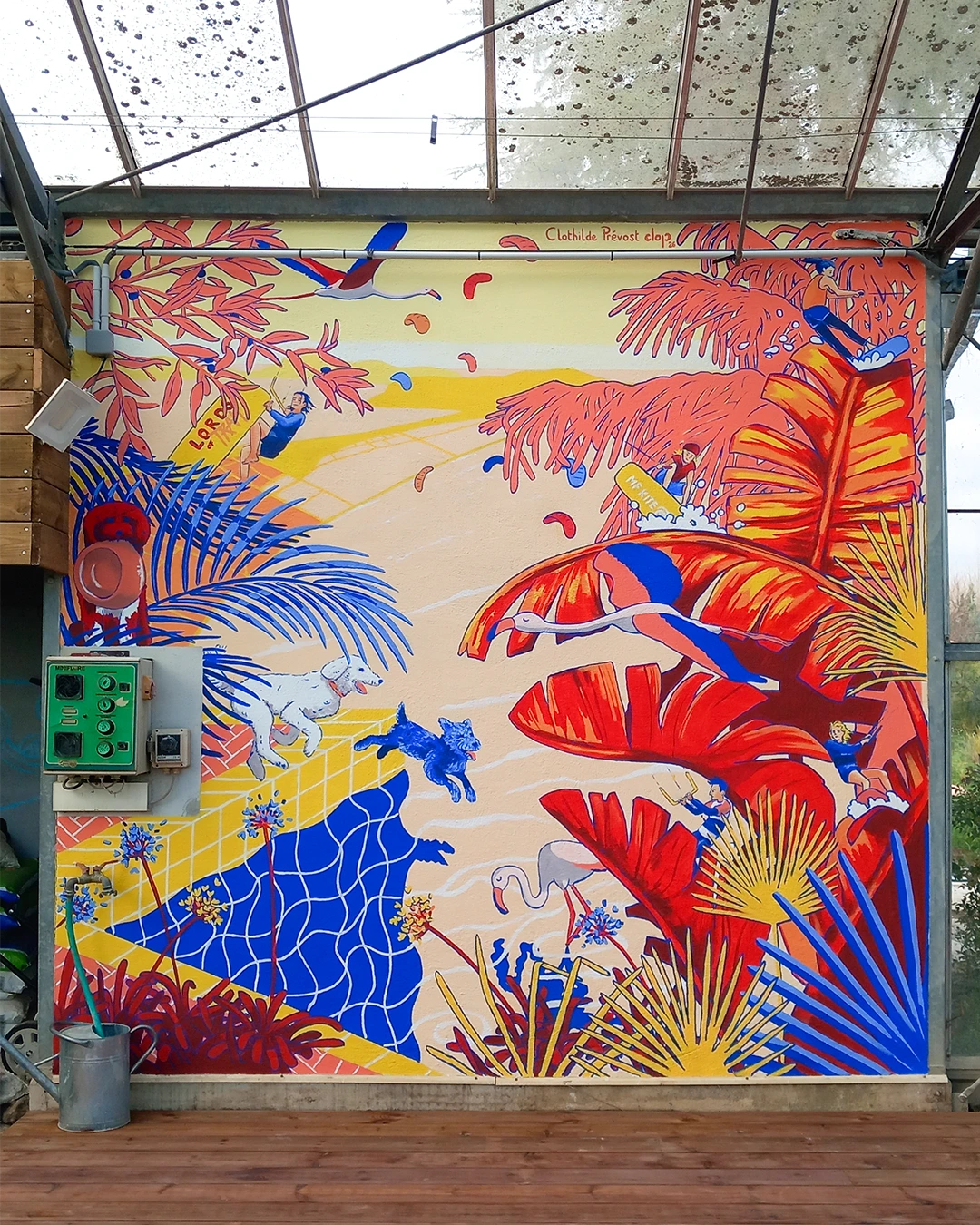 Ma cliente souhaite une fresque originale et personnalisée, destinée à orner une serre. L’œuvre représente les différents membres de la famille 🐶 et leur passion pour les sports nautiques (kitesurf, wakeboard🏄), le tout dans une nature méditerranéenne foisonnante.