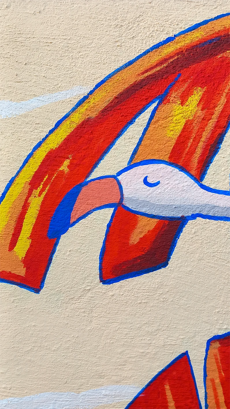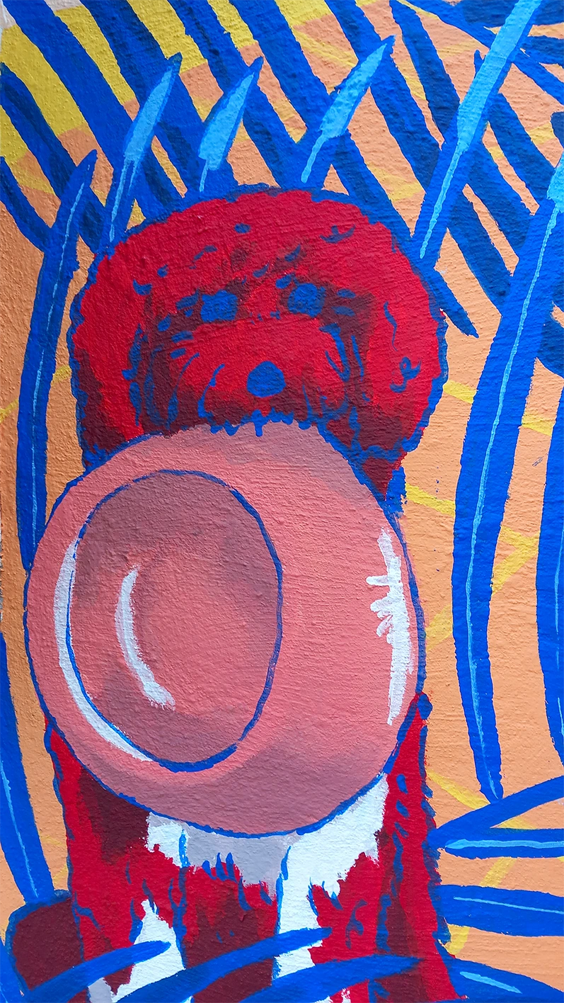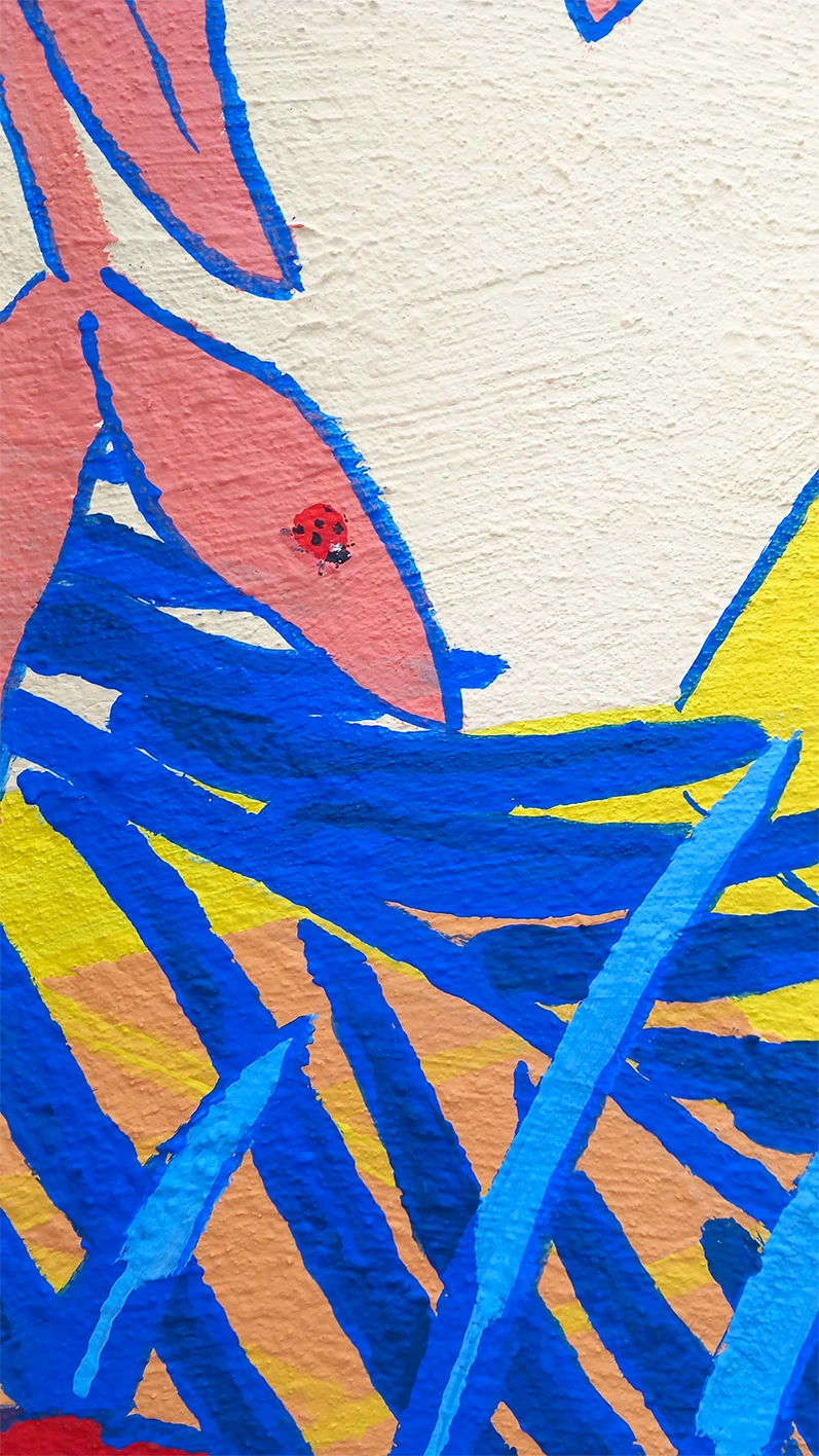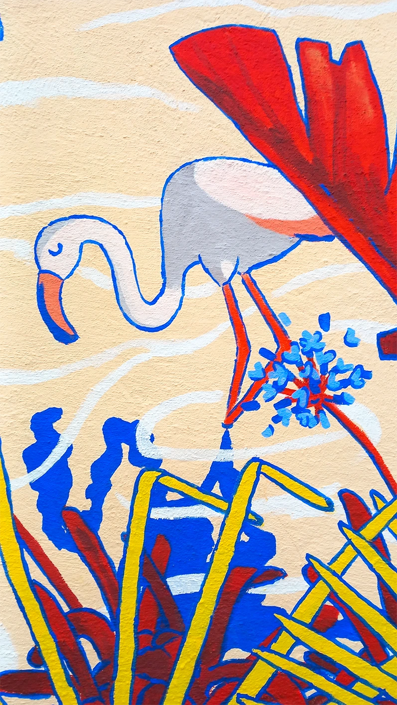 La nature domine dans la composition à travers deux aspects : l’eau et la végétation. Entre un bleu Majorelle, et un rouge puissant sur les feuilles de bananiers, des teintes pastels lumineuses et chaleureuses équilibrent l’ambiance de la scène.
